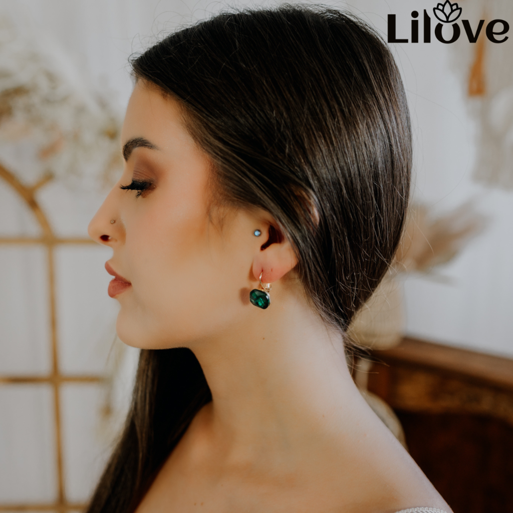 Modelka prezentuje ten sam model kolczyków w innym kolorze - również dostępny w naszej ofercie.