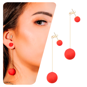 Kolczyki złote czerwone wiszące długie pluszowe kulki - lekkie, eleganckie